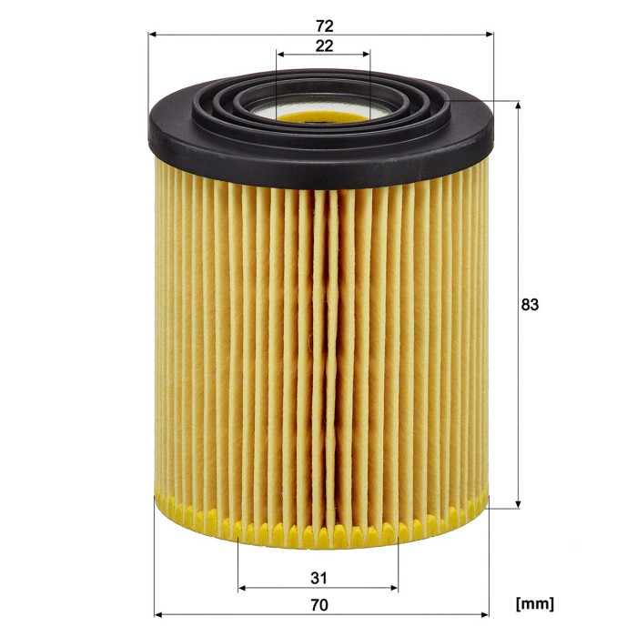 Diámetro exterior (A) = 72 mm; Diámetro interior (B) = 22 mm; Diámetro interior 1 (C) = 31 mm; Diámetro exterior 1 (D) = 70 mm; Altura (H) = 83 mm